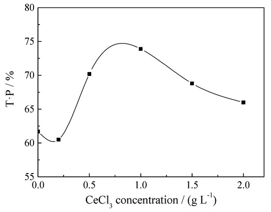 It could be seen that the addition of CeCl3 could improve the throwing power of the bath solution, showing a tendency of first increasing and then decreasing. When the concentration of CeCl3 was 1.0 g L−1, the percentage throwing power, T.P.%, of the plating solution reached 73.9%, which is relatively high [9]. It is supposed that M (m1/m2) is the weight distribution ration in the base plating bath, and M′ (m′1/m′2) is the weight distribution ration in the plating bath containing CeCl3. Based on the result in Figure 6, it can be inferred that: