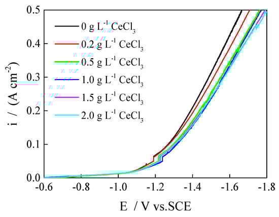 Cathodic polarization curves of the samples in the plating solutions with different concentrations of CeCl3.