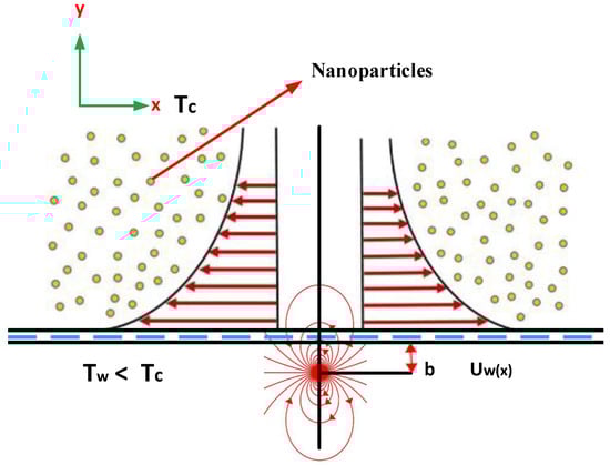 Considering a two-dimensional MHD, incompressible, boundary layer, micro-polar magnetic nano-fluid flow over an electrically nonconducted stretching surface, we found that the magnetic nano-fluid contains ferromagnetic and ferrimagnetic particles suspended with ethylene glycol C2H6O2 as a conventional fluid over a stretching surface. We decided on a two-coordinate system so that the dimensions of the surface would be designated along the x-axis and the y-axis. is the velocity of the sheet, as shown in Figure 1. The stretching gives the impression in the sheet and is proportionate to the distance from the origin. Moreover, the magnetic dipole is located nearly at distance b from the x-axis outside the fluid and is retained in such a manner that its middle is accurately placed on the y-axis. The magnetic field points of the magnetic dipole are applied in the positive x-direction. By saturating the ferrofluid, the magnetic dipole substantially escalates the strength of the magnetic field. The temperature at the stretching sheet is lower than the cure temperature , and is the temperature of the fluid away from the surface, where and the fluid that is away from are incapable of being magnetized. The variable temperature is considered at the surface and is , away from the surface. The governing equations for flow can be expressed as [31]