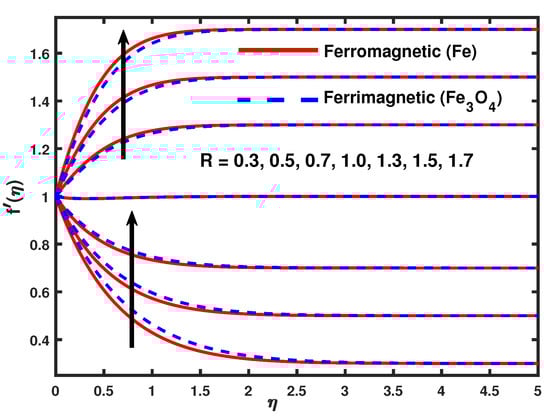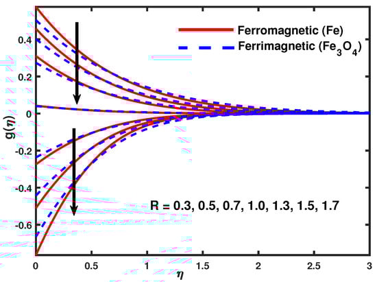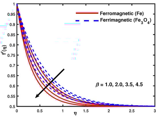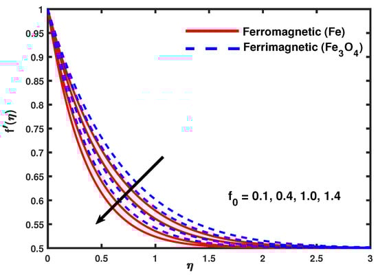 Furthermore, all the other parameters were fixed (). Our results have decent agreement with the published results that declare the legitimacy of the finite element method and is shown in Table 3 and Table 4. Table 3 shows the consequences of the heat transfer proportion, which is assimilated through the finite element method and is associated through the results of earlier studies and with the exact solutions of [38,39,40,41]. To ensure the accuracy of the existing precise values, the conclusions attained by the finite element method for the Nusselt number, the steady flow and the computed results that are stated in earlier studies are shown in Table 3. The current results achieved the same intensity and are accurate. To determine the uniformity and validation of the results, the results were exhaustively compared with those of [42,43,44], and these results were effectively replicated, as shown in Table 4. The current results are in complete concurrence. The grid invariance test was performed to ensure accuracy to five decimal digits. Figure 2 shows the effects of the ferromagnetic and ferrimagnetic particles and the suction/injection parameter on the velocity profile for both the linear and nonlinear sheet. The velocity profile is decreasing and the momentum boundary layer thickness increases as values of increase up to a certain distance . The flow velocity form intensifies due to ferromagnetic (Fe) and ferrimagnetic (Fe3O4). This shows that the thickness of the boundary layer for nano-particle Fe3O4 is more progressive than that of Fe. Compatibly, Figure 3 illustrates that micro-rotation velocity fluctuates directly by inoculation through the stretching sheet and that the velocity field decreases with increasing values of up to a certain distance . Figure 4 shows that the thickness of the thermal boundary layer of ferromagnetic (Fe) nano-particles is maximally intensified than ferrimagnetic (Fe3O4).