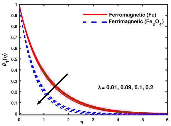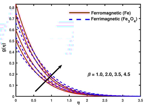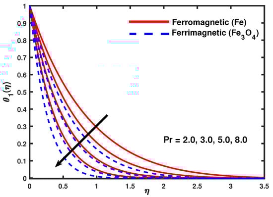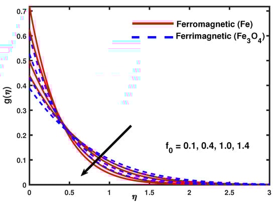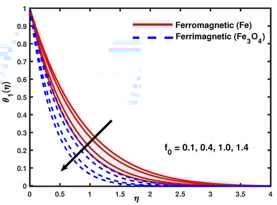 The thermal boundary layer becomes thinner. As a continuous stretch in the sheet causes fluid movement in the boundary layer region, the fluid absorbs heat, and a decrease in temperature results. Figure 5 illustrates that the influence of , the distance from the origin to the center of magnetic dipole , and the Curie temperature are very important for steadying the ferromagnetic and ferrimagnetic effects on the flow problem. The presence of nano-particles of ferrite in fluid leads to ferromagnetic fluid, the thickness of the fluid intensifies, and a decline, as a result, occurs in the velocity field with increasing values of . From Figure 6 and Figure 7, it is clear that increments in the value of causes enhancements in micro-rotation velocity and in temperature dispersals.