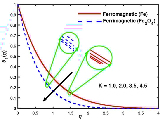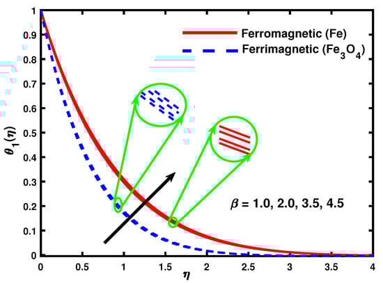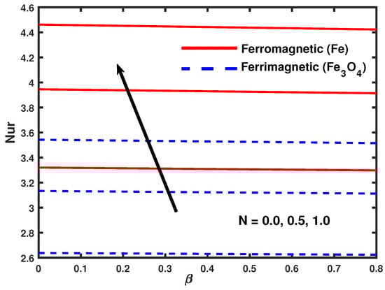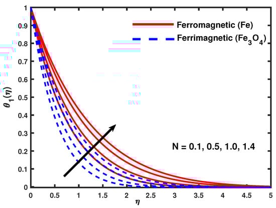 Figure 15 shows the effects of on temperature. The increment in increases the heat transfer coefficient, which increases the temperature of the ferromagnetic and ferrimagnetic nano-particles and decreases the thermal boundary layer width. The surface temperature is greater for high values of . The discrepancy in heat transfer rates with disparate values of N, and for different nano-particles is shown in Figure 16. The heat transfer rate is higher for growing values of N, and the boundary layer thickness is declining. Figure 17 shows that the Nusselt number is high for ferromagnetic nano-particles compared to ferrimagnetic nano-particles.
