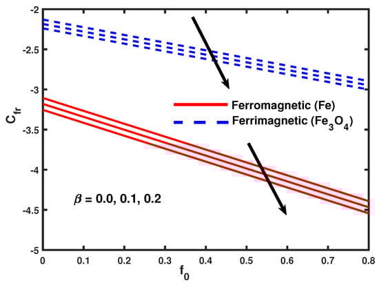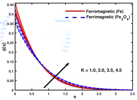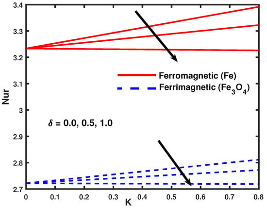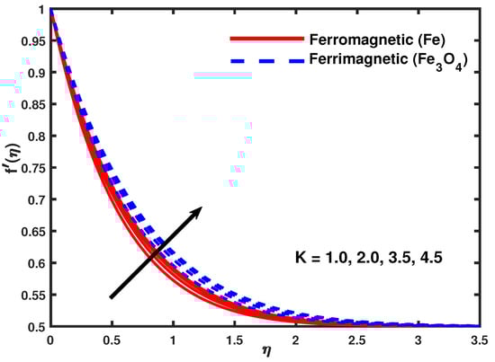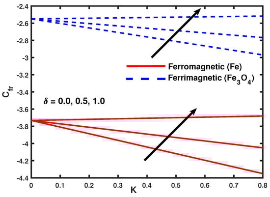Additionally, the heat transfer rate increases with increasing values of and K. Figure 18 illustrates that the magnitude of the co-efficient of skin friction decreases by increasing values of the parameter and . Figure 19 shows the skin friction coefficient affected in the presence of a magnetic dipole. The magnetic dipole affects on the Fe (ferromagnetic) and Fe3O4 (ferrimagnetic) nano-particles, so the viscosity of the nano-fluid inside the boundary layer is improved, and raises the wall shear stress. Therefore, the coefficient of skin friction increases by increasing values of the parameter and K.
