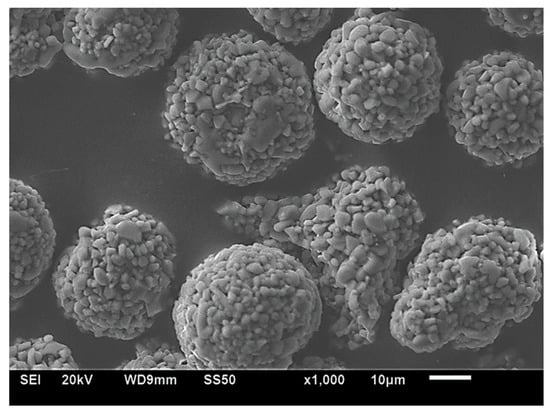 A commercially available powder (Metco 6221, Oerlikon, Switzerland) of Al2O3 + 13 wt % TiO2 (AT13) was used as a feedstock material for spraying process. The SEM micrographs (JEOL JSM-6610A, Jeol, Tokyo, Japan) showed that the particles had spherical morphology, as the powder was produced by agglomeration and sintering (Figure 1). Powders consisted of small evenly distributed particles of Al2O3 and TiO2. The nominal powder particle size range was equal in the range between 15 and 45 μm. The powder particles size was confirmed by laser diffraction granulometry (Horiba Partica LA-950 V2, Horiba Ltd., Kyoto, Japan). The results showed that powder had a volume–surface mean diameter dv50 equal to 33.3 μm and was characterized by narrow and monomodal particle size distribution. According to XRD analysis (Bruker AXS, Billerica, MA, USA), powder consisted of α-Al2O3, rutile-TiO2, and aluminum titanate Al2TiO5.