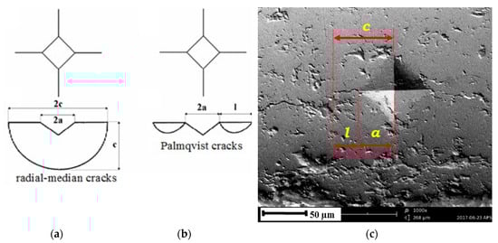 Geometry and vertical section of cracks around Vickers print []: (a) radial-median mode, (b) Palmqvist mode, and (c) exemplary crack after Vickers indentation [].