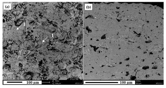 Dark areas visible in the coatings’ cross-section represent pores, voids, and cracks, which are inherent feature of APS coatings [,,]. In all coatings, Al2O3 and TiO2 were evenly distributed [,]. It should be noticed that the substrate/coating interface did not reveal any discontinuities—it is well known that addition of TiO2 to Al2O3 improves adhesion between coating and substrate, due to lower melting temperature than of pure Al2O3 []. In each sample, the rough substrate asperities, being a result of abrasive blasting, were well covered by the Al2O3 + 13 wt % TiO2 splats.