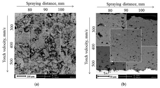 The micrographs of as-produced coatings are collected in Figure 4. It can be seen that the microstructure of coatings was influenced by the spray process parameters (summarized in Figure 5). While the shortest spray distance was used, the coatings were characterized by well-melted lamellas. This can be observed especially on their top surfaces (Figure 4a,c). The increase in the distance between the torch and the substrate caused some of the powder particles to cool down before hitting the substrate. As a result, those coatings (Figure 4e,g,i) were not that homogeneous, with less-flattened deposits, and their microstructure consisted of two regions: fully melted and partially melted areas. Similar results were obtained by Goberman et al. []. Furthermore, when comparing coatings sprayed with different torch scan velocities, some differences may be observed as well. Once the lowest torch scan speed was used (300 mm/s), the substrate and coating were highly exposed to heat generated by the plasma torch. As a result, some single inter- and intra-lamellar cracks are visible in those coatings (AT13-1 and AT13-4 presented in Figure 4b,h). On the contrary, once the torch scan speed was increased to 400 or 500 mm/s, the cracking of coatings was almost eliminated.