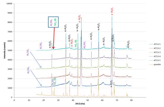 Another important issue, is still a lack of understanding about the influence of formation of aluminum titanate (Al2TiO5) on the microstructure and mechanical properties of Al2O3-13 wt % TiO2 coatings []. Therefore, in the presented studies, AT13 coatings, derived from agglomerated and sintered powder, were sprayed according to the 2k + 1 design of experiment and analyzed in the terms of their morphology, microstructure, phase composition and resulting mechanical and wear properties, including: adhesion, microhardness, fracture toughness (Kc) and sliding wear resistance. Coatings sprayed from the agglomerated nanopowders, due to their favorable properties, were claimed to found a wide range of application, for example in printing industry and for tribological usage.