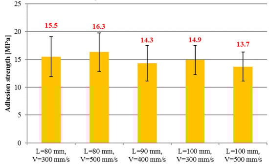 All coatings were investigated in pull-off test in order to determine their adhesion to the substrate. The results of bond strength testing are presented in Figure 8. The mean values of adhesion were ranging from 13.7 ± 2.6 MPa to 16.3 ± 3.5 MPa. In general, the coatings sprayed with shortest spray distance were characterized by higher adherence to the substrate. This can be explained by higher particle velocity influencing the impact momentum. It is believed that the increase in impact momentum improves the flattening of splats and allows better penetration of substrate asperities by deposits. The bond strength of presented coatings was similar to the results reported in literature, and indicated as sufficient for the exploitation [].