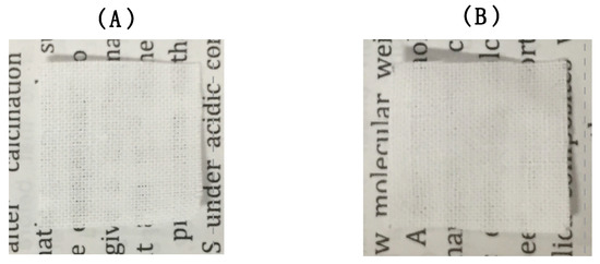 Photograph of original cotton fabric (A) and modified cotton swatch with RF-VMSiO2/TAZ nanocomposites (B); used oligomer: 30 mg; 10% aq. TAZ solution: 100 mg (Run 1 in Table 1).