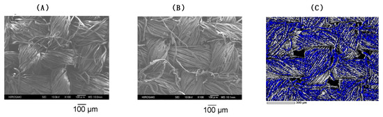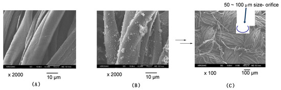 SEM pictures of pristine cotton swatch (A), the modified cotton watch with RF-VMSiO2/TAZ composites (Run 1 in Table 2) (B,C).