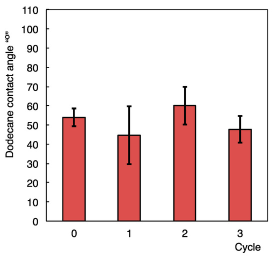 Relationship between the dodecane contact angle values on the modified cotton swatch and cycle of washing the modified cotton swatch with water.