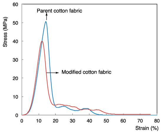 We have studied the mechanical property of the modified cotton swatch (square of 10 mm × 20 mm × 244 μm (fabric thickness): Run 1 in Table 2). The original cotton fabric (square of 10 mm × 20 mm × 225 μm (fabric thickness)) was examined for comparison. Typical stress–strain curves for the modified cotton fabric with the original one at the crosshead speed of 200 mm/min at room temperature are shown in Figure 6.