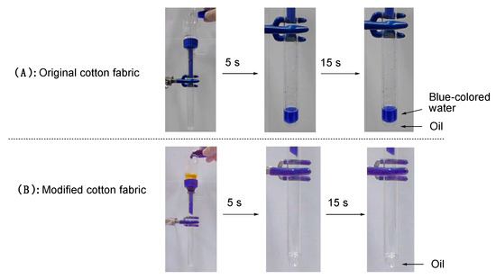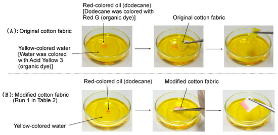 Figure 8A and Supplementary Materials Movie S (2A) show that the original cotton swatch adsorbed not only red-colored oil (oil:dodecane; dodecane was colored with organic dye (Red G)) but also yellow-colored water (water was colored with organic dye (Acid Yellow 3)); however, we could find the residual red-colored oil droplets spread on yellow-colored water interface. On the other hand, interestingly, the present modified cotton swatch could adsorb only red-colored oil droplets spread on the yellow-colored water interface under similar conditions. Thus, we could not detect the adsorbed yellow-colored water into the modified cotton fabric at all, due to its superoleophilic/superhydrophobic property (see Figure 8B and Supplementary Materials Movie S (2B)).