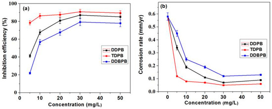 Figure 1a,b show corrosion inhibition efficiency and corrosion rate of different concentrations of DDPB, TDPB and DDBPB, respectively. The inhibition efficiency was found to increase while corrosion rates were found to decrease at 25 °C as the concentration of inhibitors (DDPB, TDPB and DDBPB) increases from 5–30 mg/L in a similar pattern but at different rates. This is an indication that DDPB, TDPB and DDBPB effectively retard dissolution of X-60 mild steel in 1 M HCl solution when compared with the blank (absence of inhibitor). However, a further increase in concentration to 50 mg/L resulted in lower efficiency. This behavior can be attributed to the attainment of optimum coverage of all inhibitors at 30 mg/L and the possibility of additional concentration of inhibitors unadsorbed on the metal surface tends to interact with the adsorbed inhibitor and thereby causing desorption of the absorbed molecule with the consequence of reduced inhibition efficiency. A similar kind of behavior for a particular corrosion inhibitor in different concentrations has been reported in the literature [48]. Surprisingly, TDPB was observed to be about 90.9%, while DDPB and DDBPB achieved 87.1% and 79.4%, respectively, making order of corrosion mitigation effectiveness to be TDPB > DDPB > DDBPB for the gravimetric study at 25 °C.