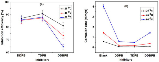 Gravimetric measurement for 24 h immersion time of 30 mg/L of DDPB, TDPB and DDBPB X-60 mild steel in 1 M HCl solution at different temperatures; (a) inhibition efficiency and (b) corrosion rate at 25 °C, 45 °C and 60 °C.