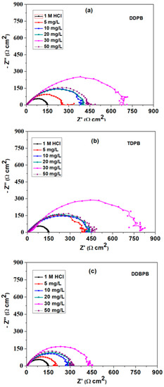Nyquist plots for X-60 mild steel in 1 M HCl solution at 25 °C in the absence and presence of different concentrations of (a) DDPB, (b) TDPB and (c) DDBPB.