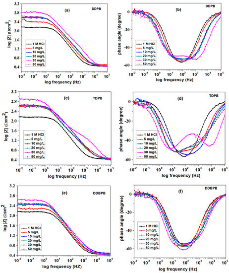 Bode plots for X-60 mild steel in 1 M HCl solution at 25 °C in the absence and presence of different concentrations of (a,b) DDPB, (c,d) TDPB and (e,f) DDBPB modulus and phase angle, respectively.