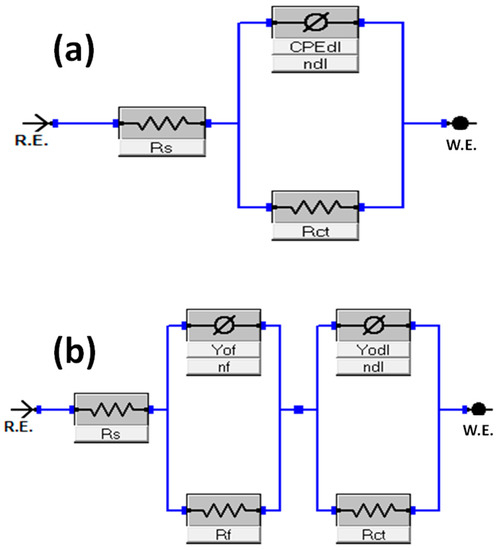 Equivalent circuit diagrams for impedance data fittings in 1 M HCl solution in the (a) absence and (b) presence of DDPB, TDPB and DDBPB.