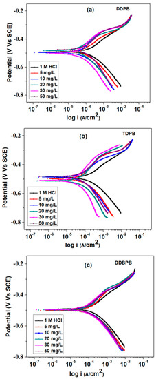 Potentiodynamic polarization plots of X-60 mild steel in 1 M HCl solution at 25 °C in the absence and presence of different concentrations of (a) DDPB, (b) TDPB and (c) DDBPB.