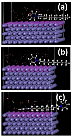 The most stable energy configurations for the adsorption energy of DDPB, TDPB and DDBPB that were carried out in aqueous phase with 30 molecules of water to mimic corrosion environment snapshots are shown in Figure 8. It can be observed that the pyridinium ring is the center of adsorption for all Fe(110)/inhibitors systems. However, orientation of the aromatic ring of DDPB (Figure 8a) and TDPB (Figure 8b) are tilted in the same manner on the Fe(110) surface, while that of DDBPB (Figure 8c) is parallel with maximum contact on the Fe(110) surface and the other ring is tilted but does not have contact with the Fe(110) surface. It has been reported that the more negative adsorption energies of inhibitors are responsible for their degree of interactions with the metal surface and, thereby, proportional to their corrosion efficiencies [56]. Adsorption energies of −34.1, −38.5 and −42.6 Kcal/mol computed for DDPB, TDPB and DDBPB, respectively, from the Monte Carlo simulation are shown in Table 3. The higher adsorption energy of TDPB than DDPB is in agreement with the experimental results. However, the highest adsorption energy of DDBPB when compared with both TDPB and DDPB from the simulation study will distort the order of inhibition efficiencies (TDPB > DDPB > DDBPB) from the experimental results. Therefore, the rate of adsorptions of DDPB, TDPB and DDBPB on mild steel surface is likely not the only factor responsible for the order of their corrosion inhibition efficiencies.