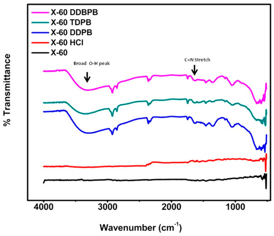 Adsorption of inhibitors on the substrates was confirmed with Thermo Nicolet 6700 FTIR spectrometer (Thermo Scientific, Fishers, IN, USA) with Smart Orbit diamond micro-ATR. After background correction, a total of 16 scans was performed between 500 and 4000 cm−1 for identifications of functional groups of inhibitors on the mild steel coupons.
