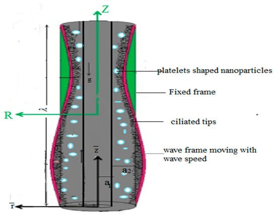 A cilium is a microscopic, contractile, thin fiber-like slender appendage/protrusion that projects from surfaces of specific cells. In the adult human body, epithelial cells along with motile cilia are very prominent in specific brain sections. Due to their motility, they possess a considerable role in many physiological processes like locomotion, alimentation and respiration. Peristalsis is a spontaneous process of a symmetrical wave’s expansion and contraction within flexible boundaries. Ciliary-induced peristalsis appears significantly in various biological transport processes such as in biomedicine, physiology and nuclear reactors. Recently, Awais et al. [] examined second-law analysis for peristaltic nanofluid flow caused by ciliary action with magnetic effects. Furthermore, they studied convective peristalsis of viscous fluid by considering non-uniform viscosity [] as well. Furthermore, the concept of peristaltic pumps, instigated by Engelman [], has latterly been prominent in several biological functions including roller pumps and heart-lung machines etc. As peristalsis is a cutting-edge field due to physiological applications, several theoretical as well as experimental attempts have been made to incorporate nanoparticles in order to improve thermal performance in biomedical processes. Rashidi et al. [] exemplified the application of MHD peristaltic transport of blood containing nanoparticles in drug delivery through an incompatible channel which is practically imperative in the bio-sciences. Hayat et al. [] explicated mixed convective heat transfer in the peristalsis of nanoparticles suspended in water assuming convective boundary conditions and joule heating. Recently, Maqbool et al. [] inspected the impacts of nanoparticles on magnetohydrodynamic tangent hyperbolic fluid transportation in a ciliated tube.