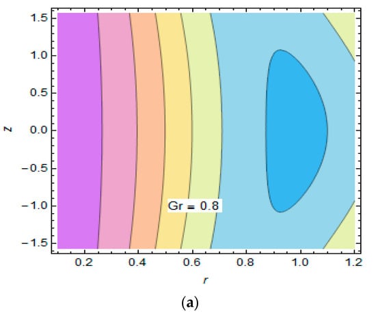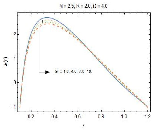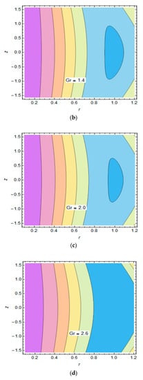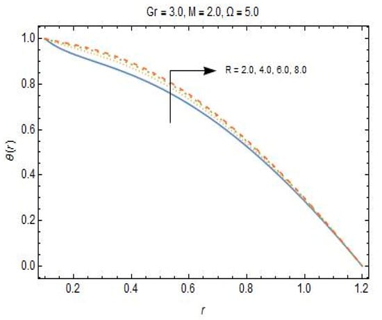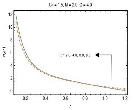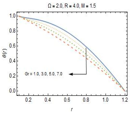 The consequences of emerging parameters on the temperature profile are inferred in Figure 9 and Figure 10. Correspondingly, a decrease in temperature of the hybrid nanofluid for gradually mounting values of Gr is observed in Figure 9. The physics behind such behavior is an increase in heat-transfer rate due to enhancing buoyancy forces for rise in values of Gr. An increasing response of temperature of the fluid towards the magnetic Reynolds number is noted in Figure 10. This reveals that for high values of R, fluid particles gain more kinetic energy which is directly related to fluid temperature. All the results are plotted for mean flow rate Q = 2.