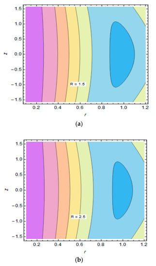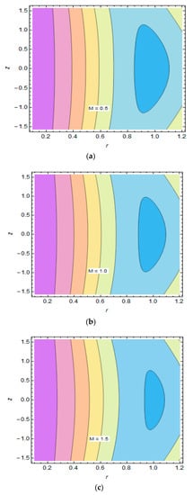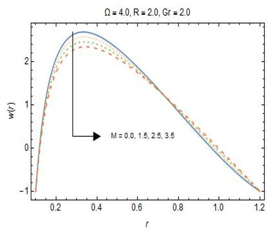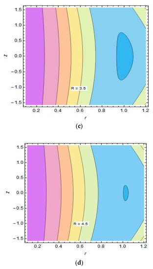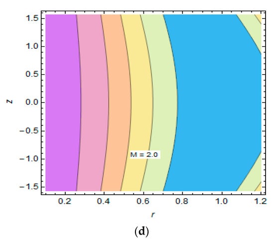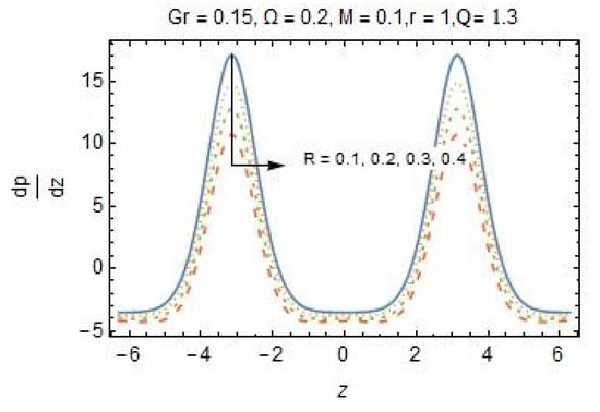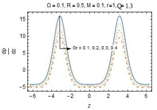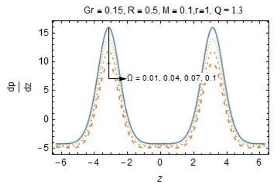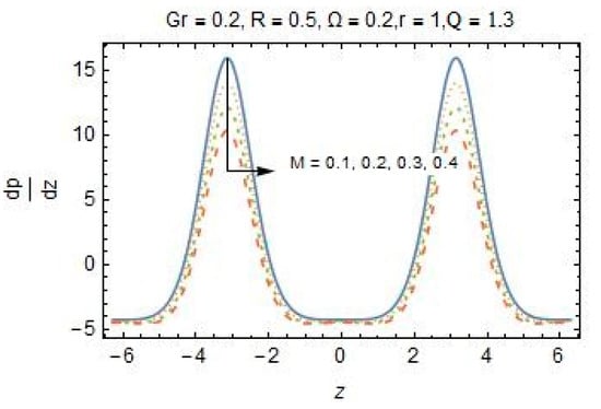 The pressure gradient illustrates a direction and rate of rapid variation in pressure. Therefore, the pressure gradient towards embedding parameters such as the heat-generation parameter (Ω), Hartmann number (M), magnetic Reynolds number (R) and Grashof number (Gr) are studied and portrayed in Figure 18, Figure 19, Figure 20 and Figure 21. It is perceived from these plots that the pressure gradient decreases rapidly with the variation in all the parameters. Hence, flow can easily pass through the endoscope for a small pressure gradient at r = 1 (near outer tube) exclusive of the imposition of the high-pressure gradient.