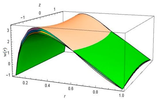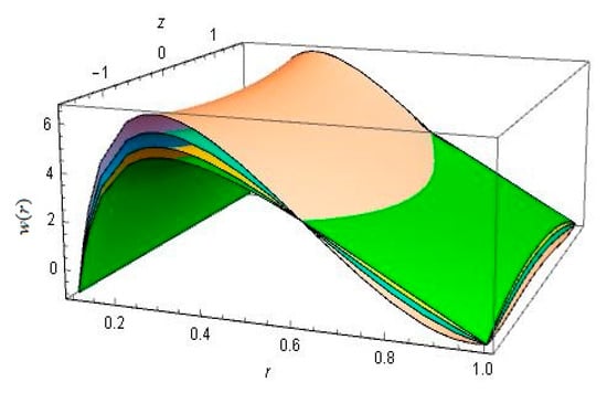 Furthermore, there is a three-dimensional physical interpretation of the velocity profile for variation in values of magnetic Reynolds number, Grashof number and Hartmann number, as displayed in Figure 11, Figure 12 and Figure 13, respectively. The velocity maps out the parabolic trajectory for all the involving parameters. It is seen that velocity profile changes its behavior in the intervals 0.1 ≤ r ≤ 0.6 and 0.61 ≤ Υ ≤ 1.0 and the influences of the parameters on axial velocity are similar to the two dimensional velocity behaviors.