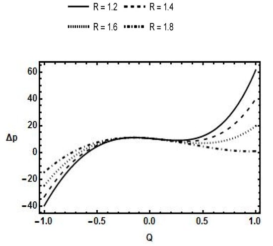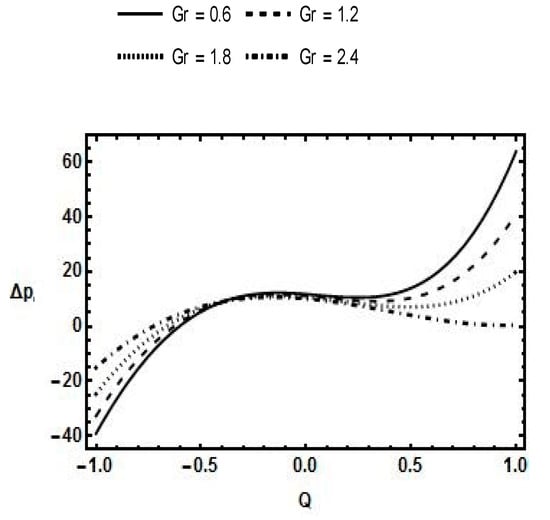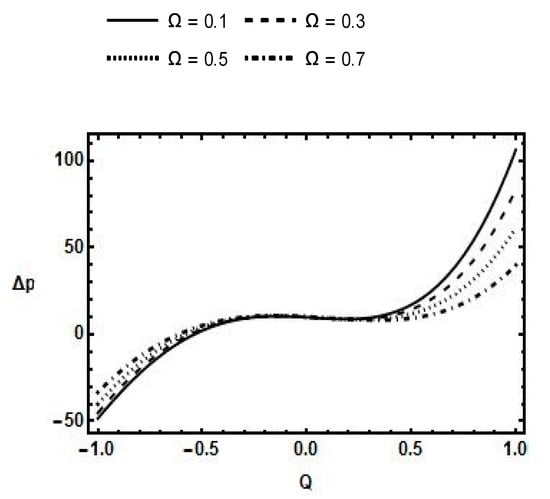 Besides this, the maximum pressure rise towards which peristalsis behaves as a pump is analyzed by means of pressure rise for one wavelength. In this regard, Figure 14, Figure 15, Figure 16 and Figure 17 are prepared which exhibit the influence of embedding parameters correspond to pressure rise per wavelength towards mean flow rate. Non-linear behavior of these curves characterizes non-Newtonian fluid. All these plots contain four main parts (a) peristaltic pumping region, i.e., (b) free pumping region, i.e., (c) co-pumping region, i.e., . In the region of peristaltic pumping, flow rate is positive and caused by peristalsis that occurred due to overcoming pressure difference while peristalsis of the boundaries of tube yields a free-pumping region. In the region of co-pumping, flow due to the peristalsis is assisted by negative pressure difference. The influence of the heat-generation parameter and Hartmann number are shown in Figure 14 and Figure 15, and it is perceived that the pressure rise in co-pumping region () for Gr and () for M are decreasing. As, for Ω = 0.1, 0.3, 0.5, 0.7 and M = 0.0, 0.5, 1.0, 1.5, corresponding co-pumping regions contain (Q ∈ [−1.0, −0.45], Q ∈ [−1.0, −0.42], Q ∈ [−1.0, −0.4], Q ∈ [−1.0, −0.39]) and (Q ∈ [−1.0, 0.5], Q ∈ [−1.0, 0.48], Q ∈ [−1.0, −0.56], Q ∈ [−1.0, −0.4]), respectively. Pumping and free-pumping regions are increasing due to temperature gradient by buoyancy effects and increasing induction, correspondingly. Moreover, a similar trend for a rise in the values of Gr and R is depicted in Figure 16 and Figure 17, and it is witnessed that the co-pumping region contains Q ∈ [−1.0, −0.4] but the pumping region is increasing.