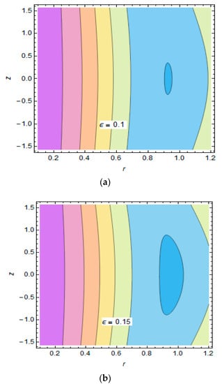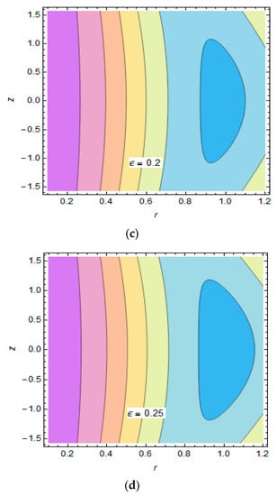 Trapping is a significant observable fact, whereby a bolus is transported with the wave speed and then a trapped bolus pressed forward along metachronical waves. These configurations are plotted in Figure 22, Figure 23, Figure 24 and Figure 25 for different values of sundry parameters with panels (a)-(d) which inspect the ciliary-induced peristaltic flow pattern in the annulus. In general, the shape of streamlines is similar to the wave moving parallel to the walls of the tube. Under specific conditions, streamlines split and form a bolus which moves and circulates along the channel. The setup for the magnetic Reynolds number (R) is explained in Figure 22 for M = 1.5, Gr = 0.8, Q = 2, ε = 0.2. Higher values of R yield oscillatory motion of the fluid, and therefore a confined bolus decreases in size. Figure 23 depicts the behavior of streamlines for M = 1.5, R = 2, Q = 2, ε = 0.2 and it is perceived that with an increment in values of Gr, the confined bolus is shrinked moving towards the boundary of external tube and finally disappear due to temperature distribution caused by buoyancy forces. A similar formation of the flow pattern against rising Hartmann number is explored in Figure 24 with Gr = 0.8, R = 2, Q = 2, ε = 0.2. Physically, enhancement in magnitude of M augments fluid velocity which opposes trapping. This is in view of the fact that the magnitude of the amplitude ratio parameter (ε) indicates the length of cilia and the increment in values of ɛ enlarges cilia. The trapped bolus grows in size and circulates speedily as noticed in Figure 25. Thus, the presence of cilia favors trapping.
