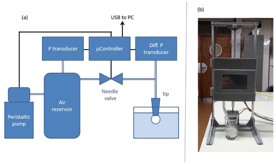 For very short and intermediate adsorption times (from milliseconds to hundreds of seconds), dynamic surface tension, γ(t), was measured by means of a homemade apparatus using the maximum bubble pressure technique (MBP). The setup is similar to the one described elsewhere [10,15] and is shown in Figure 1. The technique is based on the measurement of the maximum pressure needed to form a bubble at the tip of a capillary immersed in the surfactant solution. The pressure is related to the surface tension by the Young-Laplace equation [16], ∆P = 2γ/r being r the radius of the capillary. The device consists of a peristaltic pump which pressurizes a 1 dm3 air reservoir, an electrically controlled needle valve (Aalborg PSV1S-VA with its driver module PSV-D, Organgeburg, NY, USA) that controls the air flow to a micro-pipette tip (Sartorius Optifit 791000, Buenos Aires, Argentina) and acts as the capillary, and is placed 5 mm below the solution’s surface. The pressure difference, ∆P, inside the tip was measured with a differential pressure transducer (Cole-Palmer GY-98073-08, Vernon Hills, IL, USA) and transmitted using USB to a PC by a Teensy 3.2 microcontroller board. The Teensy board also senses and controls the reservoir pressure (pressure transducer Ashcroft G2-7-M02-15-G2-30G, Stanford, CT, USA) and the needle valve opening. The tip makes an angle of 30° with respect to the interface and is discarded after each measurement. Each tip is calibrated with pure water prior to measurement by measuring the ∆P as a function of depth, which is precisely controlled by means of the step-motor.