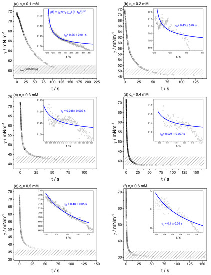 Dynamic surface tension curves for 6 surfactant concentrations well below the cmc (a) cs = 0.1 mM; (b) cs = 0.2 mM; (c) cs = 0.3 mM; (d) cs = 0.4 mM; (e) cs = 0.5 mM; (f) cs = 0.6 mM. The insets are amplifications of the very short adsorption times regions, the curves in them are fittings with Equation (3). The shaded regions represent the equilibrium surface tension (with error) measured by the Wilhelmy plate technique.