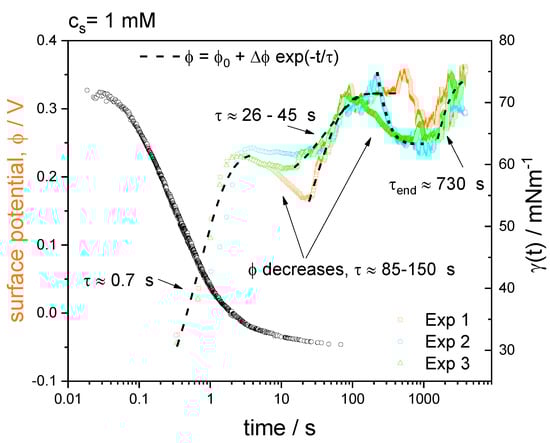 In order to shed light on the processes involved in the adsorption dynamics, and the role played by the charges at the interface, we performed time-resolved surface potential experiments, as explained in the methods section. In Figure 6 we present the results for cs = 1 mM, superimposed to the dynamic surface tension curve in a semi-log plot. We show simultaneously three independent measurements of the surface potential as a function of time. The three curves are different but all of them present general common features. Note that, at short times, there is a fast increase of surface potential followed by a decrease and several oscillations, those oscillations were not replicated on the surface tension dynamics. In the figure, we included the relaxation times obtained by fitting certain parts of the curves with exponentials (see discussion).