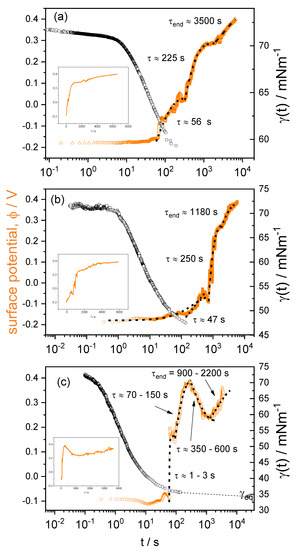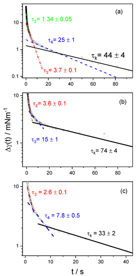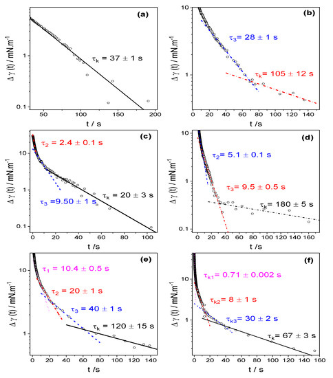 This behavior can be seen in the insets of Figure 5, the characteristic times found by fitting with Equation (5) are labelled as τ1 and shown in Table 2. In Equation (5), γeq and γ0 are the equilibrium surface tension of the solutions, and pure solvent, respectively.