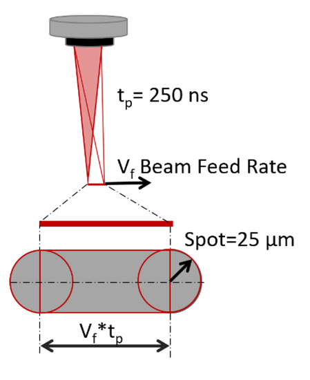 The energy density (ED), defined as energy per surface area, depends on the pulse energy at different frequencies, the area swept during the pulse, and the number of repetitions in each area, which is equivalent to the number of overlapped tracks. For the calculation of the area, the spot diameter on the surface is considered to be 50 µm and the distance traveled in each pulse is taken into account (Figure 2). Thus, the energy density or fluence can be calculated through Equation (1).