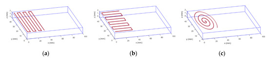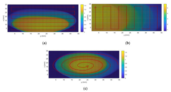 The object under evaluation and analysis in these simulations is the homogeneity of the thermal footprint at the interface, in order to find the most efficient trajectory. The model was validated for the 3.1 kW laser used in the experimental joining by measuring temperature data with thermocouples and pyrometers to adjust the energy loss parameter introduced in [16]. The simulations were carried out on aluminum specimens measuring 105 mm in x, 45 mm in y, and 2 mm in z axes. The mesh discretization was done with values dx = dy = dz = 0.5 mm. As in the experimental procedure, the contact area was 35 mm in x and 45 mm in y, the trajectory radial step was 5 mm, and margin limits were 2.5 mm in both x and y axes. Three types of trajectories were simulated: zig-zag parallel to the x-axis (Figure 4a), zig-zag parallel to the y-axis (Figure 4b), and spiral trajectory (Figure 4c).