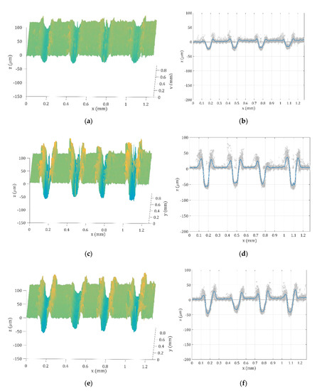 Figure 8a shows the topography reconstruction for 30 kHz and Figure 8b shows the mean profile, where the band containing all extracted profile measurements can also be seen. In Figure 8c,d, the topography and profile measurements for 50 kHz are shown. The extracted profiles show a variability higher than 50 µm in the burr height, causing a non-uniform behavior in shear strength. On the other hand, when the frequency is 70 kHz, Figure 8e,f show better results in terms of burr height homogeneity.