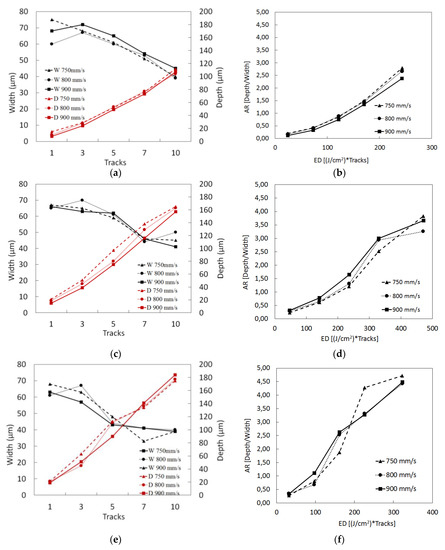 On the other hand, the linear behavior in the evolution of depth for the different pulse frequencies and feed rates is remarkable, as can be appreciated in Figure 9a,c,e for different frequencies and feed rates. The slope of the linear approach has little sensitivity to speed variation and increases significantly with an increase of pulse rate. Also, as the frequency increases, a higher material removal rate is achieved, which translates into a greater depth for the same number of overlapped tracks. After 5 overlapping tracks, the slot width decreases to values below the diameter of the laser beam itself, indicating an accumulation of re-solidified material in the upper area of the cavity. If the slot width is below 40 µm, the thermoplastic material cannot flow correctly at the junction. Thus, for 50 kHz the limit would be 5 passes and for 70 kHz the limit would be 3 passes, while at 30 kHz the material removal rate is insufficient and has significant variability. This effect is also noticeable when the groove Aspect Ratio (AR) is evaluated based on the energy density (ED). In Figure 9b,d,f, instead of showing a linear evolution, for ED over 200 J/cm2 the groove exhibits the above-mentioned effect—the width is reduced while the depth is increased, resulting in an AR higher than expected. Taking into account a minimum width of 60 µm, a maximum removal rate, and a minimum deviation for the tests, the parameters that provided better results included a pulse frequency of 70 kHz, a feed rate of 800 mm/s, and 3 overlapped tracks.