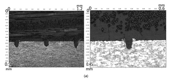 The first joining tests were carried out by taking the joining parameters used in previous work as a reference [16]. These joining tests were carried out to evaluate the influence of texture on the final bond strength. In all the tests carried out, shear strengths above 19 kN were obtained for a joint area of 35 × 45 mm, which is equivalent to 12 MPa. The maximum value was obtained for a slot with two passes in width, where the average value reached was 23.55 kN (15 Mpa). Figure 10 shows the filling of the grooves and the arrangement of the glass fibers in the composite material. A complete filling is observed in all the grooves, which indicates that the joint parameters used ensure the proper flow of the material. On the other hand, an accumulation of passes also ends up generating an area of resolved material that narrows the upper area of the groove, as can be appreciated in Figure 10c,e. In Figure 10a, two reference grooves were overlapped to reach a depth of 102 µm, keeping a width of almost 70 µm in the generated slot. In Figure 10b, as a result of overlapping height and width, the groove generated with the reference parameters is shown. In this way, the depth is almost the same as in Figure 10a, while the slot width is 85 µm. In Figure 10c, two reference grooves are overlapped in depth and three are overlapped in width, with an overlap ratio of 50%. With this strategy, slots of more than 100 µm in width are achieved, also keeping the depth constant at 100 µm. However, in this case the result is much more variable and some slots contain re-solidified material, decreasing the effective width of the slot. In Figure 10d–f, more reference grooves are overlapped in depth while the width is kept constant. In this case, the problem of re-solidified material is more noticeable, giving a higher variability in the results, as can be appreciated in Table 6 and Figure 11, where the mean values of shear strength achieved are summarized for different AR. The results in Figure 11 show that the highest shear strength with the least deviation is achieved with an AR of 1.24, corresponding to the groove shown in Figure 10b.