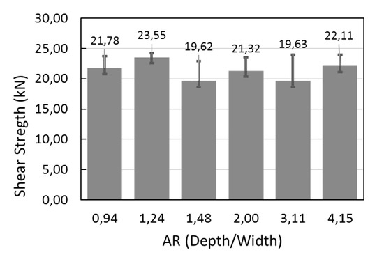 With these parameters as a reference, a second study was carried out for the generation of grooves with different AR, but while maintaining a minimum surface width of 60 µm. For this purpose, parameters of 70 kHz, 800 mm/s, and 3 overlapped tracks were used to generate reference grooves. Combining these reference grooves with an overlap ratio of 50%, different AR slots were obtained. Table 6 shows the lap shear results of the slots, with an AR between 0.94 and 4.15 and a minimum width of 60 µm in all cases.