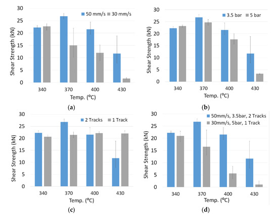 The results show that the temperature is the most influential parameter, followed by the feed rate. Figure 12a shows the results obtained for a bonding pressure of 3.5 bar and with two zig-zag sweeps. It can be seen that the set point temperature of the pyrometer is the most decisive factor, with the optimum value being 370 °C. Lower values provide insufficient melting, while higher values cause excessive melting. Similarly, a lower speed also causes higher heat accumulation, so for the reference temperature of 370 °C, when the feed rate is 30 mm/s, variable results are produced with a significant deviation, as shown in Figure 12a. On the other hand, variables such as tool pressure or even the number of passes have less influence on the result. Figure 12b shows the resistance obtained at a feed rate of 50 mm/s and with two passes for different reference temperatures and tool closing pressures of 3.5 and 5 bar. In this case, the influence of closing pressure is relatively low, with the results being slightly better at 3.5 bar, although in both cases the temperature has a greater influence. Something similar happens when the influence of the number of passes on the process is analyzed. Figure 12c shows the resistance values achieved for a feed rate of 50 mm/s and 3.5 bar pressure when the process is carried out with one and two passes at different set temperatures. For temperatures of 340 °C and 370 °C, better results are obtained with two passes, while for reference temperatures of 400 °C and 430 °C, the result is better with a single pass. This behavior is consistent with the previously identified evolution, in which excessive accumulation of heat was undesirable. Figure 12d shows the results confirming this theory, where a combination of a speed of 30 mm/s and two passes at a pressure of 5 bar gives worse results as the reference temperature increases. The fact that it is more convenient to use a two-pass versus a one-pass sweep strategy doubles the cycle time, however, it should be noted that even if the maximum of 26.7 kN is not reached, it is possible to achieve resistance values above 22 kN by increasing the reference temperature or reducing the feed rate to compensate for the overall energy input.