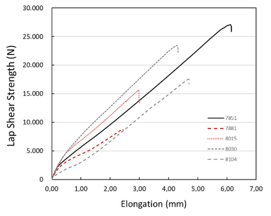 In relation to the evolution of the deformation in the shear test, when the joint is adequate, the result obtained is in line with the expected behavior for PA6. Thus, in Figure 13, different curves are observed for joints that reach values ranging from 8 kN to more than 26 kN. Although the evolution of the deformation is different depending on the quality of the joint, in practically all cases a linear evolution can be seen. Taking into account that the total length of the specimen once joined is 175 mm (corresponding to an aluminum and a composite specimen of 105 mm in length minus the overlap area), the maximum deformation achieved for an optimum joint is 6 mm. It should be noted, however, that since the specimen is a multi-material one, it is not possible to define a unitary deformation of the specimen, since in this case the composite’s PA6 material matrix inserted in the textured grooves is the one that suffers the deformation.