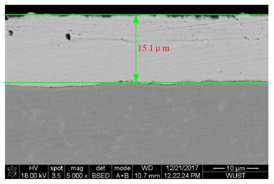 By inspecting the cross-section electron microscopic (SEM) results of many specimens, the thickness of the zinc layer is between 14.5–15.3 μm. Therefore, the thickness of DP600 zinc coating is set to 15 μm, that is to say, the upper and lower surfaces of the substrate have a zinc coating with a thickness of 15 μm, which is like a sandwich material. SEM measured the cross-section morphology of the specimens displayed in Figure 1, and the thickness of the zinc coating is 15.1 μm.