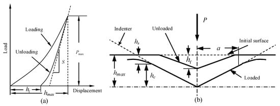 Nano-indentation experiment can obtain the young’s modulus, hardness and load displacement curve of zinc coating. Based on the dimensional analysis method, the material constitutive model of the zinc coating is constructed by processing these data. The detailed measurement principle of nano-indentation is shown in Figure 3. The hmax is the maximum depth of the indentation, the hf is the residual depth, and the Pmax is the maximum load. Contact depth hc refers to the depth of the contact between the pressure head and the pressed object when pressed into the measured material, as shown in Figure 3b. Depending on the power function law proposed by Oliver and Pharr [31], the loading and unloading curves are analyzed and fitted.