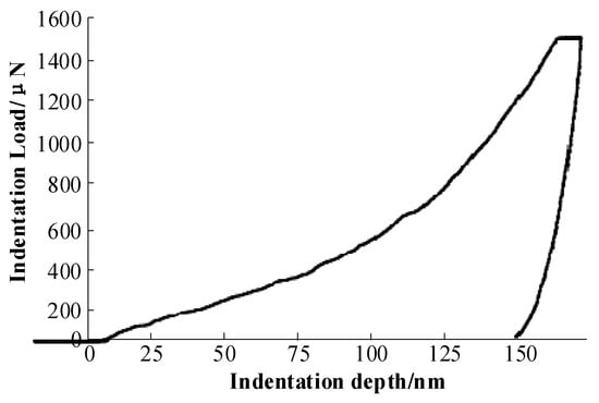 The prototype of the in-situ nano-mechanical tester used in this experiment is TI750, which is produced by Hysitron® company in the Irvine city, California, USA. The maximum load of the instrument is 30mN, and the minimum load is 70 nN. It makes the indenter of Berkovich diamond, whose elastic modulus is Ei = 1141Gpa and Poisson’s ratio is vi = 0.07. The test temperature is 25 °C, the loading mode is load control, and the constant strain rate is 0.05 s−1. The results of loading and unloading curves are shown in Figure 4. It is assumed that the stress–strain curves of zinc coating are power hardening function models, as shown in Equation (1).