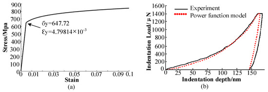 In this paper, the two unidentified parameters are solved by the combination of dimensionless analysis and finite element numerical simulation. The related parameter dimensions are shown in Table 2 as follows. According to the above analysis and test results, the elastic modulus of the zinc coating is 135 GPa. The mathematical model of stress–strain is shown in Equation (2) and the curve is shown in in Figure 5a. The finite element simulation of Nano-indentation is carried out by using the model, and it shows the compared results with the test results in Figure 5b. The deviation of the two curves is within 2%, which shows that the model can reflect the mechanical properties of the coating. The finished constitutive model of the zinc coating is given in Equation (3). The yield stress is 647.72 Mpa and the yield strain is 4.79814 × 10−3.