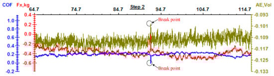 Figure 7 is the change of tangential load Fx, friction coefficient μ and acoustic signal AE with time t. The analysis shows that when the interface is broken, the tangential force will decrease sharply or to 0, and then gradually increase, which leads to the clear fluctuation of the friction coefficient and sound signal at the fracture point (the breakpoint in the Figure 7). As the polishing surface of the sample cannot be smooth, there may be impurities in the coating layer, and it does not treat the surface of the substrate which represents the coating and the substrate a staggered state of convex and concave. Therefore, the tangential force, friction coefficient and acoustic signal curve are not linear changes, but small fluctuations. However, there will be large changes in the interface failure. Considering this, we can judge the point of the critical load. Combined with the breakpoints of the curves, interface failure time is 92.22 s, and the corresponding critical load is 15.76 N, and the critical friction coefficient is 0.202.