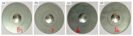 In this paper, we use the BUT400® machine as the drawing experimental equipment. As shown in Figure 9, the maximum clamping force of the sample is 400 kN, the maximum stroke of the piston is 120 mm, and the working speed is 0.750 mm/min. The test sample is a hot galvanized steel sheet DP600 with a diameter of 100mm and a thickness of 1.2 mm. By monitoring the blank holder force, we observed the influence of drawing depth on the formability of galvanized sheet. Figure 10 shows four samples of the hemispherical part drawing test.